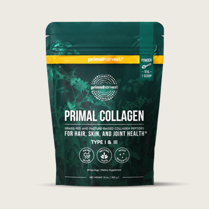 Primal Collagen, made with grass-fed, pasture-raised collagen, helps smooth skin, strengthen hair, and support joints with a neutral-tasting formula that blends effortlessly into your daily routine.*